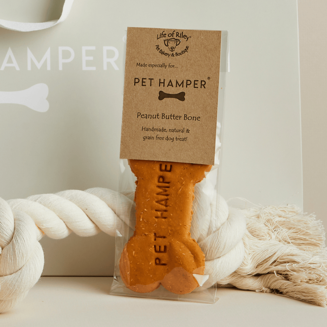 Selected by our in-house Chief Product Tester, Barney, this hamper features his favourite picks! Including the natural dog toy, with floppy ears, a rope tail and squeaker. Not to mention it measures a huge 43cm long! A 43cm natural rope toy, made to last with it’s thinner strands and a tighter weave. Lastly, this hamper contains a crunchy, handmade peanut butter bone, that is natural and grain-free. Finally, your hamper is completed with a luxury gift bag with branded tissue paper.