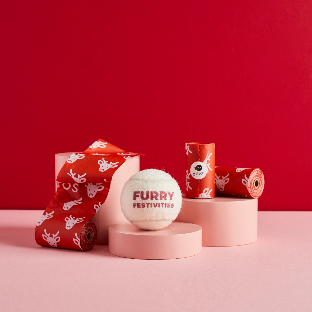 This festive furry treat is the perfect gift to pop in to a guest room this festive season when staying with a pet. Featuring our Pet Hamper exclusive festive tennis ball complete with pouch, along with those all important poop bags with a festive twist.