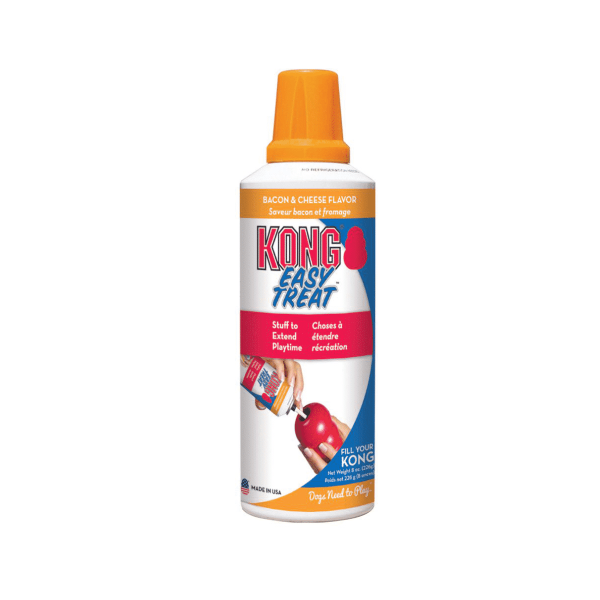 KONG Bacon and Cheese Easy Treat™ is a delicious treat that delights all types of dogs while providing an easy no-mess solution for pet parents. Made in the USA, this highly-digestible and trans-fat free treat is an enticingly delicious addition when added to a stuffed KONG. A uniquely designed nozzle easily controls the amount of KONG Easy Treat™ while also having the added benefit of a convenient, no mess stuffing solution. Want to make your stuffed KONG last longer? Freeze a stuffed KONG, topped with KONG Bacon and Cheese Easy Treat™ for a longer-lasting, mind occupying challenge. No Refrigeration required.