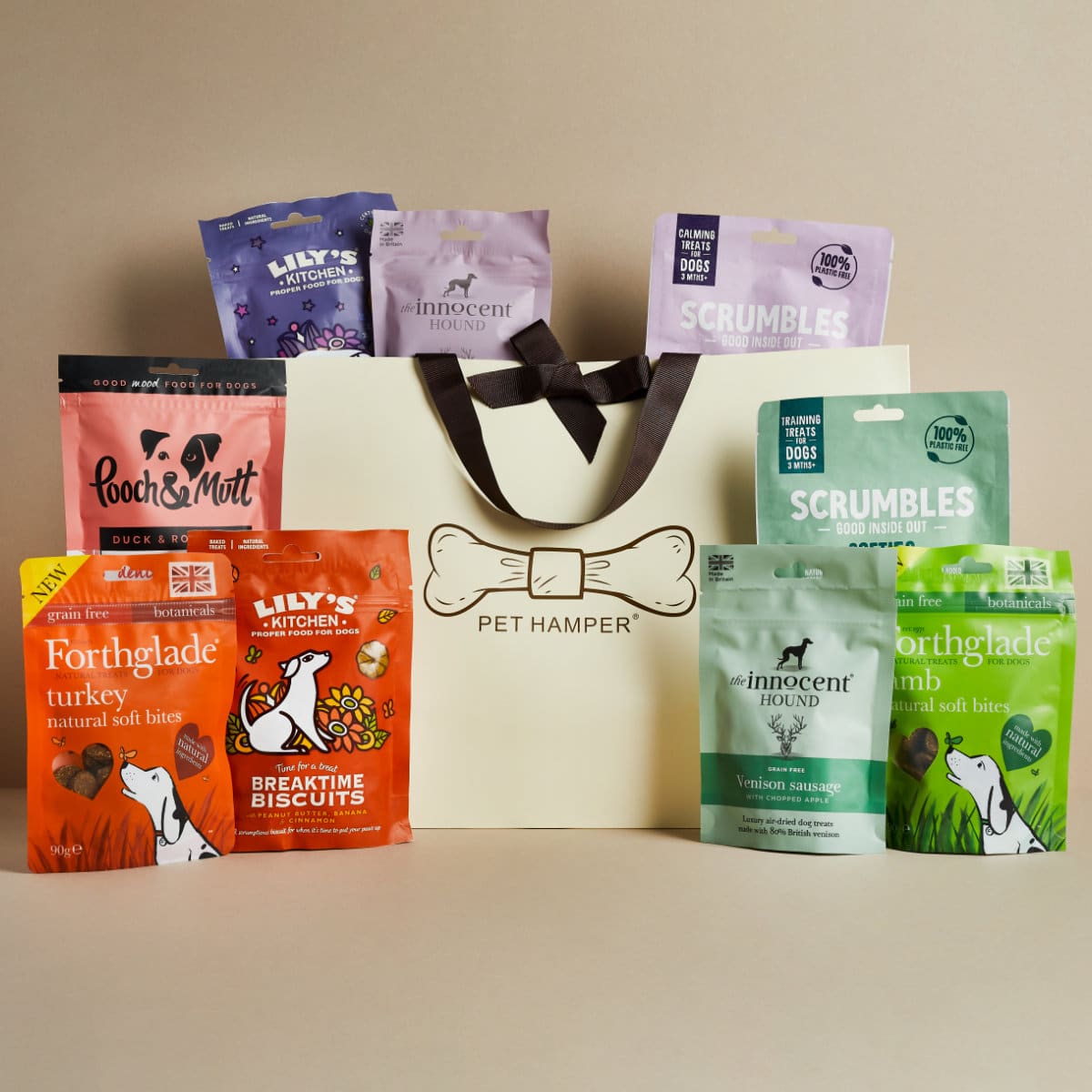 The Lux Dog Treat Hamper is the ultimate hamper for those luxury treat loving pooches. Containing Lily’s Kitchen Bedtime, Scrumbles Plant Based Softies & Calming Nibbles, the luxurious Innocent Hound Venison Sausages, Forthglade Soft Bites in Salmon & Fresh Breath treats, and Pooch & Mutt Turkey & Hemp Treats and Denzel’s Brunch Bites. This hamper is sure to be a hit with all pooches! Finally, your hamper is completed with a luxury gift bag with branded tissue paper.