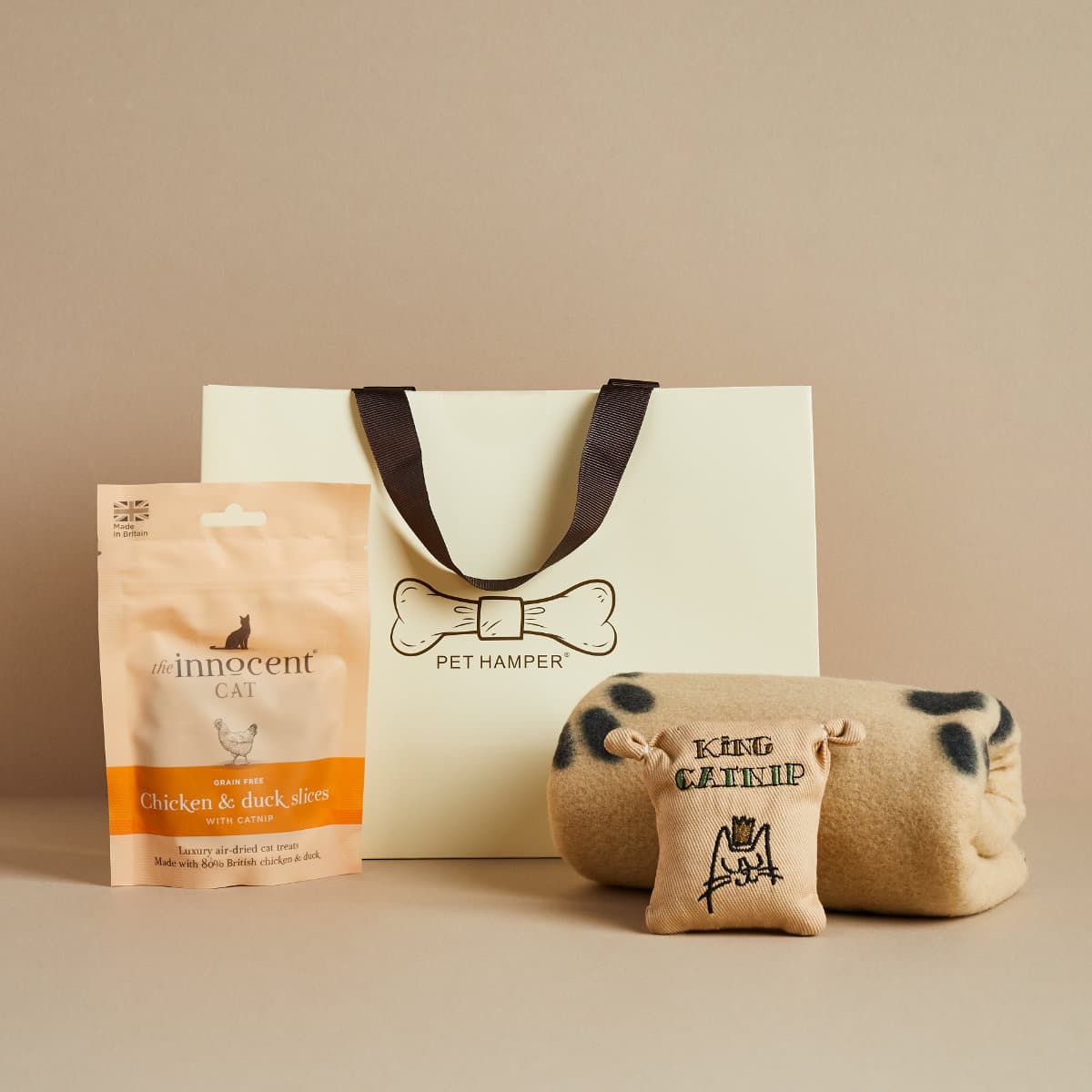 The Mini Cat Hamper is the perfect little treat for all felines. Featuring a paw print blanket for snuggle time, a King Catnip tote bag toy to stimulate playful behaviour and air-dried indulgent chicken & duck slices with catnip for a post play snack. Finally, your hamper is completed with a luxury gift bag with branded tissue paper.