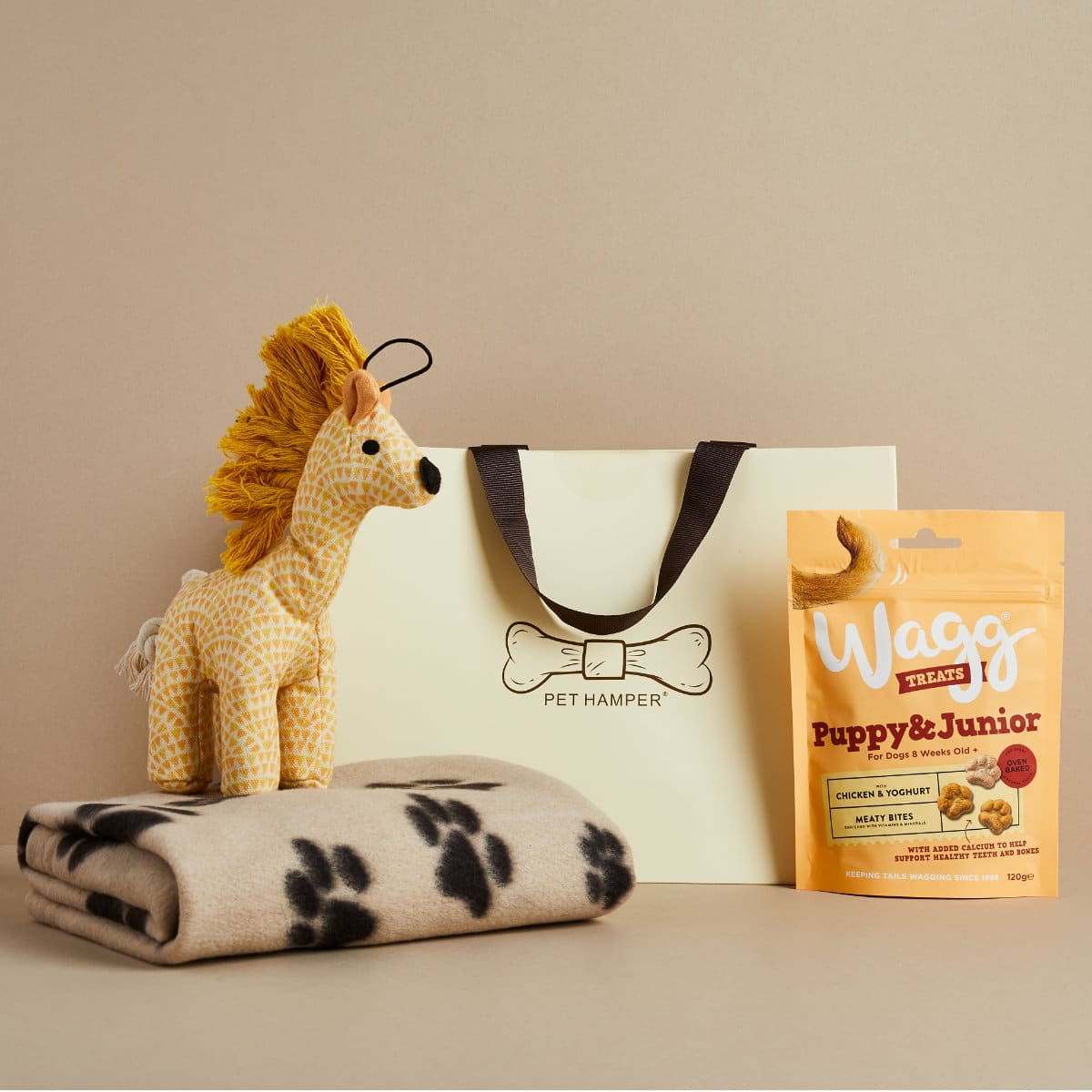 The Mini Puppy Hamper is the perfect little treat for the new pup on the scene. Includes an eco-friendly giraffe toy, salmon & sweet potato puppy treats and of course, a Pet Hamper blanket ready for snuggle time.