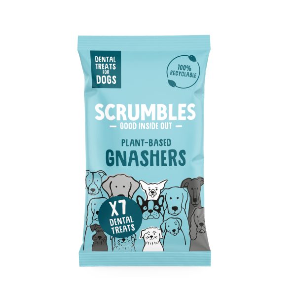 Scrumbles Gnashers are the ultimutt dental sticks for dogs. With a specially formulated recipe and crunchy texture to attack plaque and support healthy teeth. These dog dental chews are made with natural ingredients, prebiotics and active ingredients to reduce plaque. Pack size 150g.