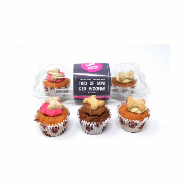 Love the large Woofins but maybe they’re a little large for your dog. Well this Trio of bite sized mini iced Woofins could be perfect for you and only 12 calories each! This pack contains 2 vanilla and 1 carob sponge, each decorated with a dash of yoghurt topping and finished with a “Spot the dog” approved bone.