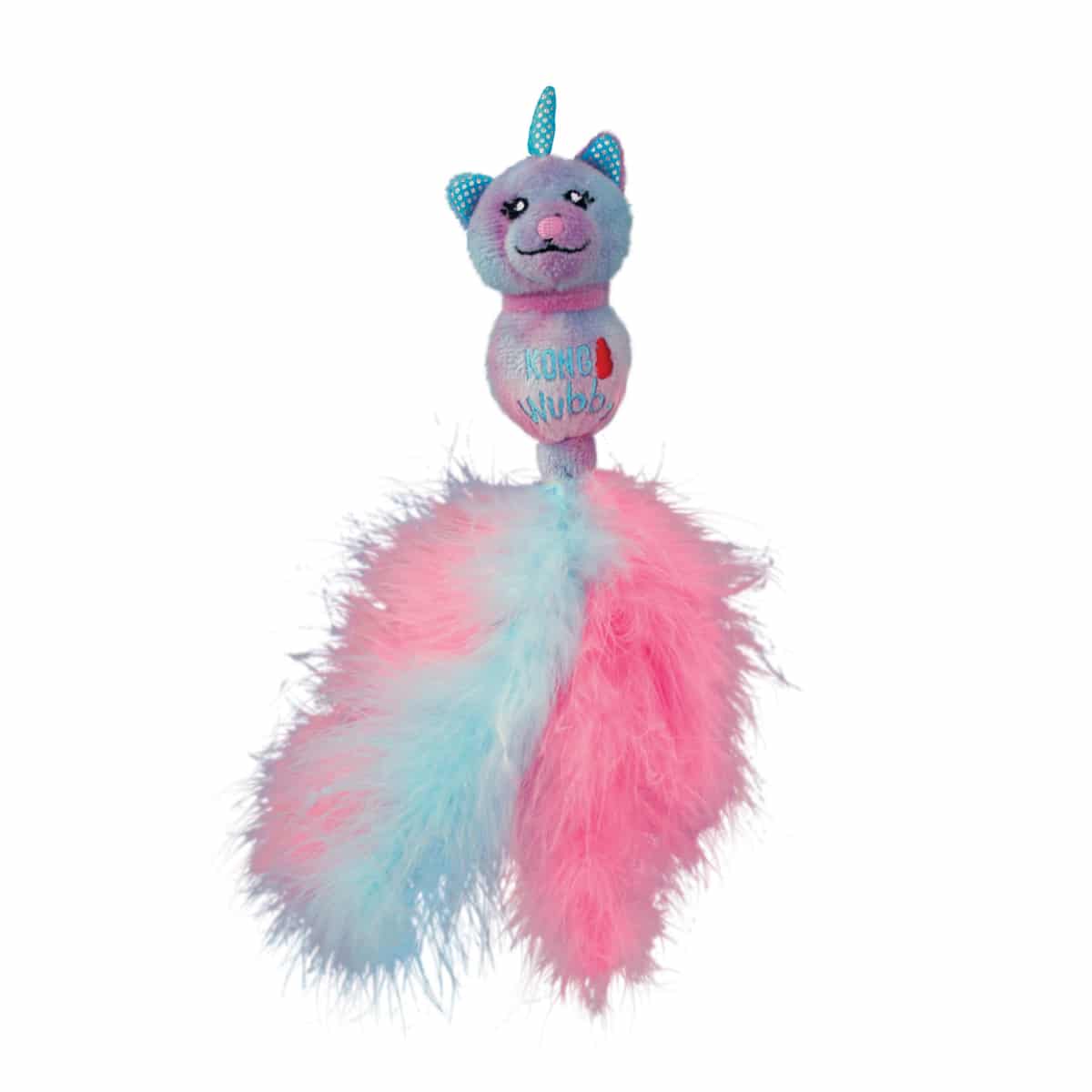 KONG Cat Wubba Caticorn’s irresistibly fluttery tail sparks cats’ instincts to stalk and capture. This mythical creature rattles to keep kitties interested and Caticorn’s round body rolls easily for action-packed pouncing and batting in a swirl of glittery, feathery play. Packed with KONG Premium North American Catnip to boost the magic.